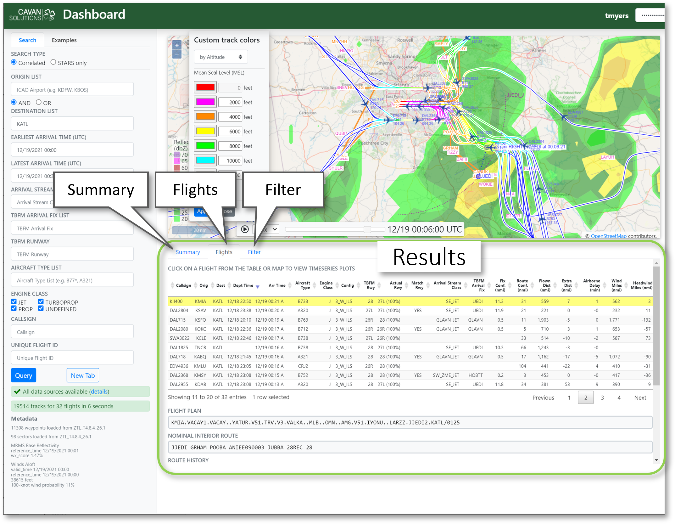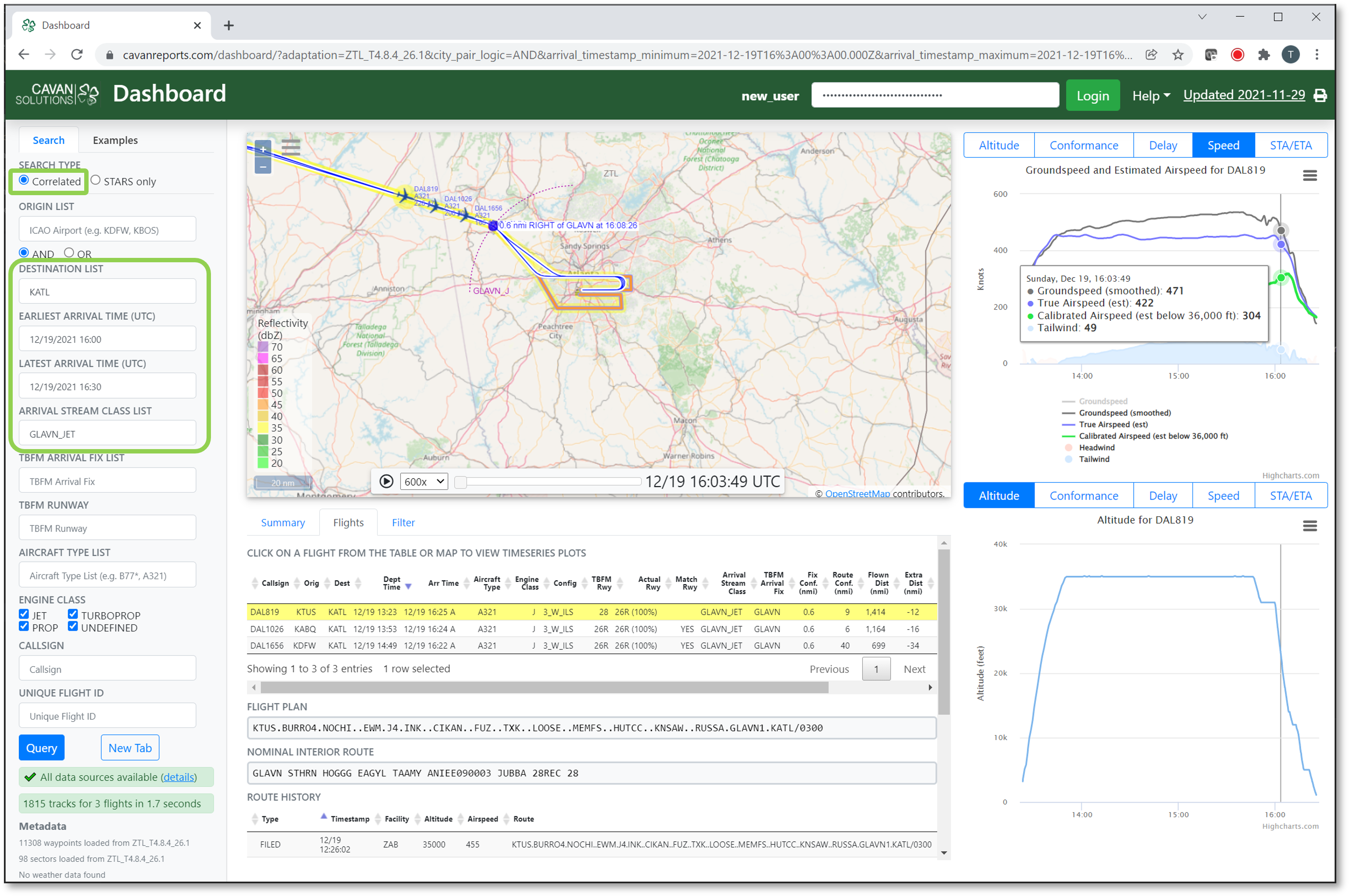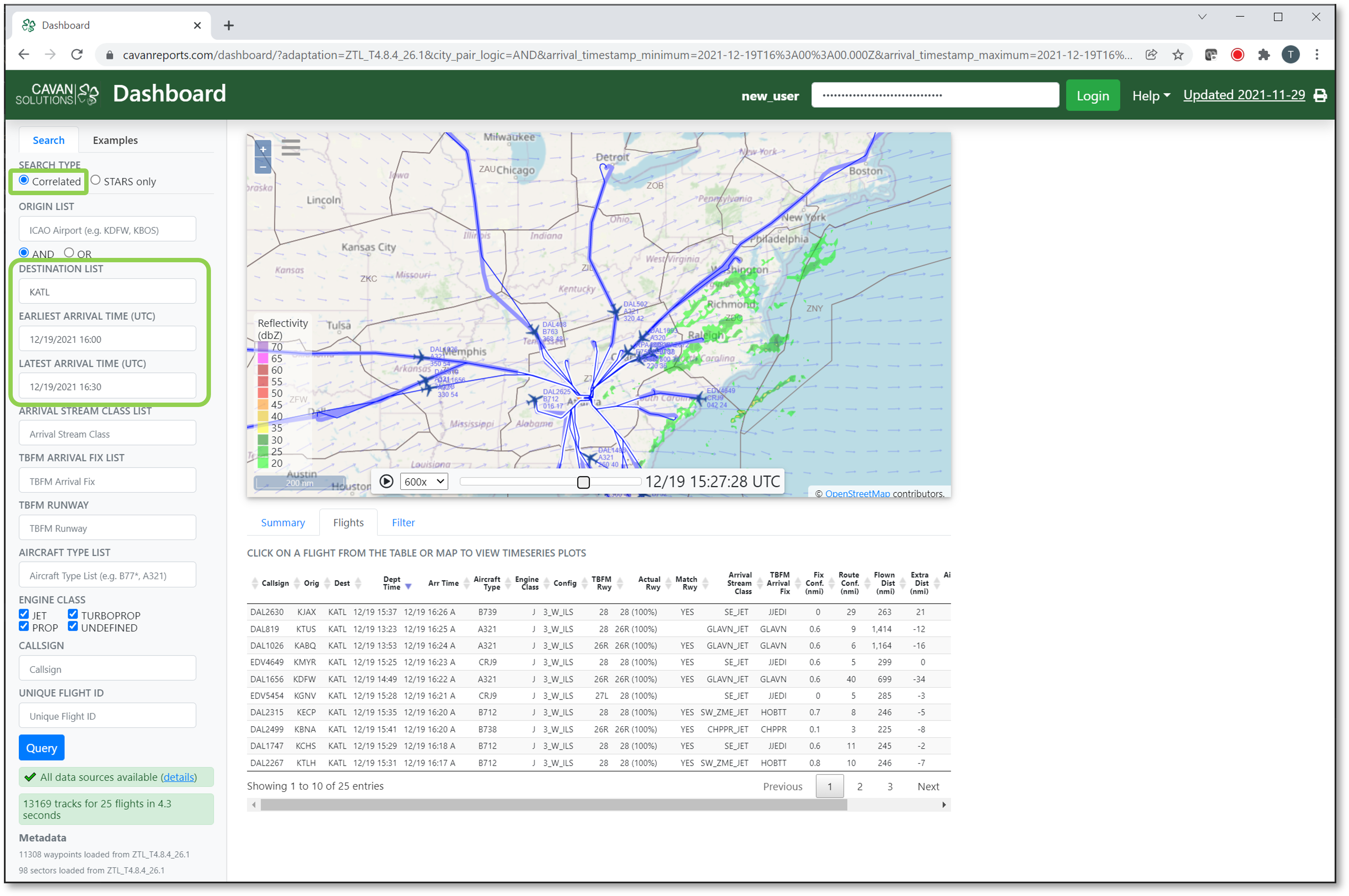 The correlated search accesses merged TFMS, TBFM, and STARS data for commercial traffic. These searches provide origin-to-destination flight plan and flown trajectory data. A 30-minute arrival time and range for a single arrival airport typically offers a good starting point. A sample search covering 30 minutes of KATL arrivals is shown below.