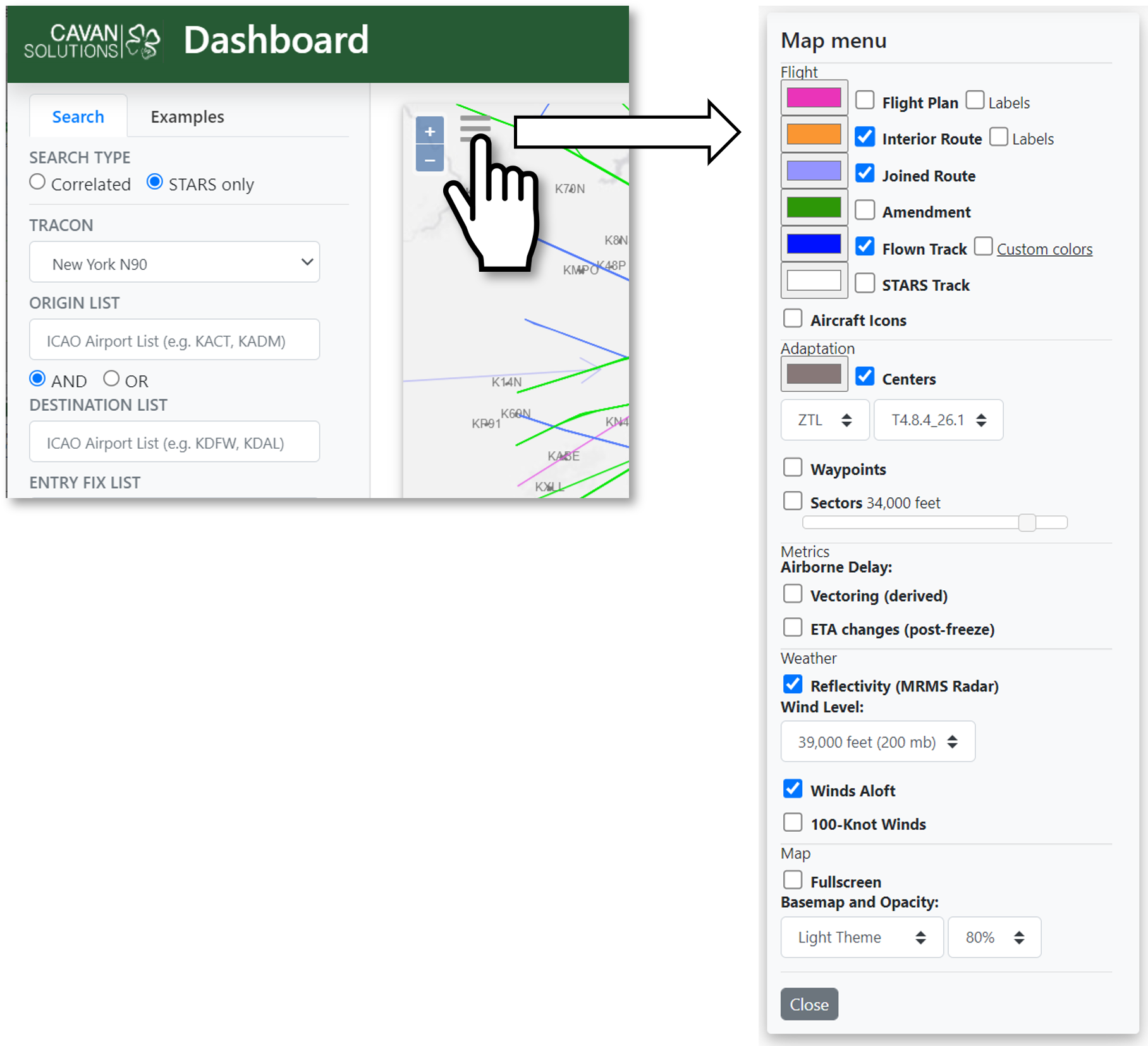 This video goes through the weather layers that can be superimposed on the map: reflectivity contours, winds aloft vectors, and regions of high wind. CavanReports processing converts gridded weather data into GeoJSON contours. Wind vectors indicate the speed and direction of the wind at the user-selected altitude. Regions containing winds in excess of 100 knots are computed by CavanReports and displayed on the map.