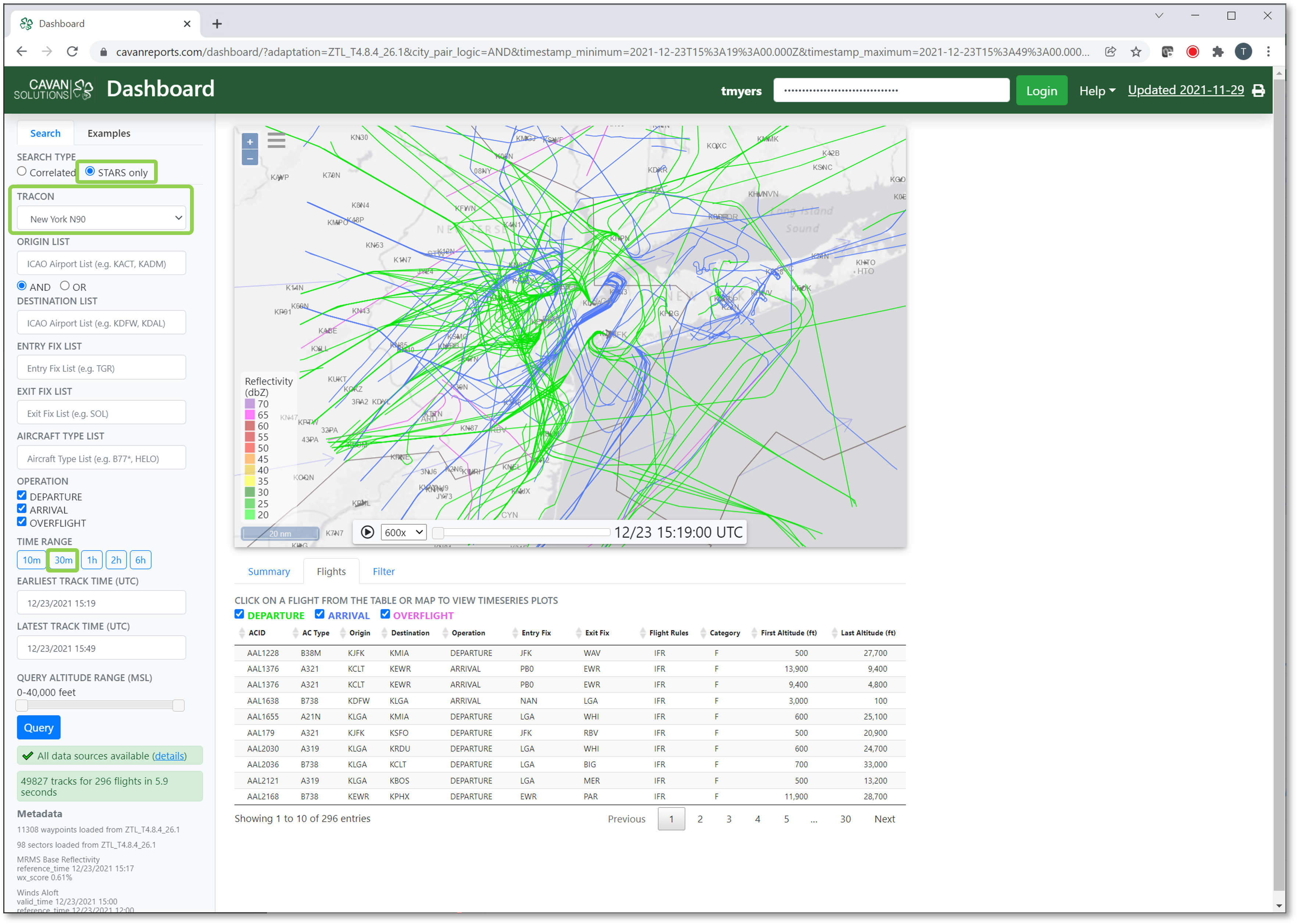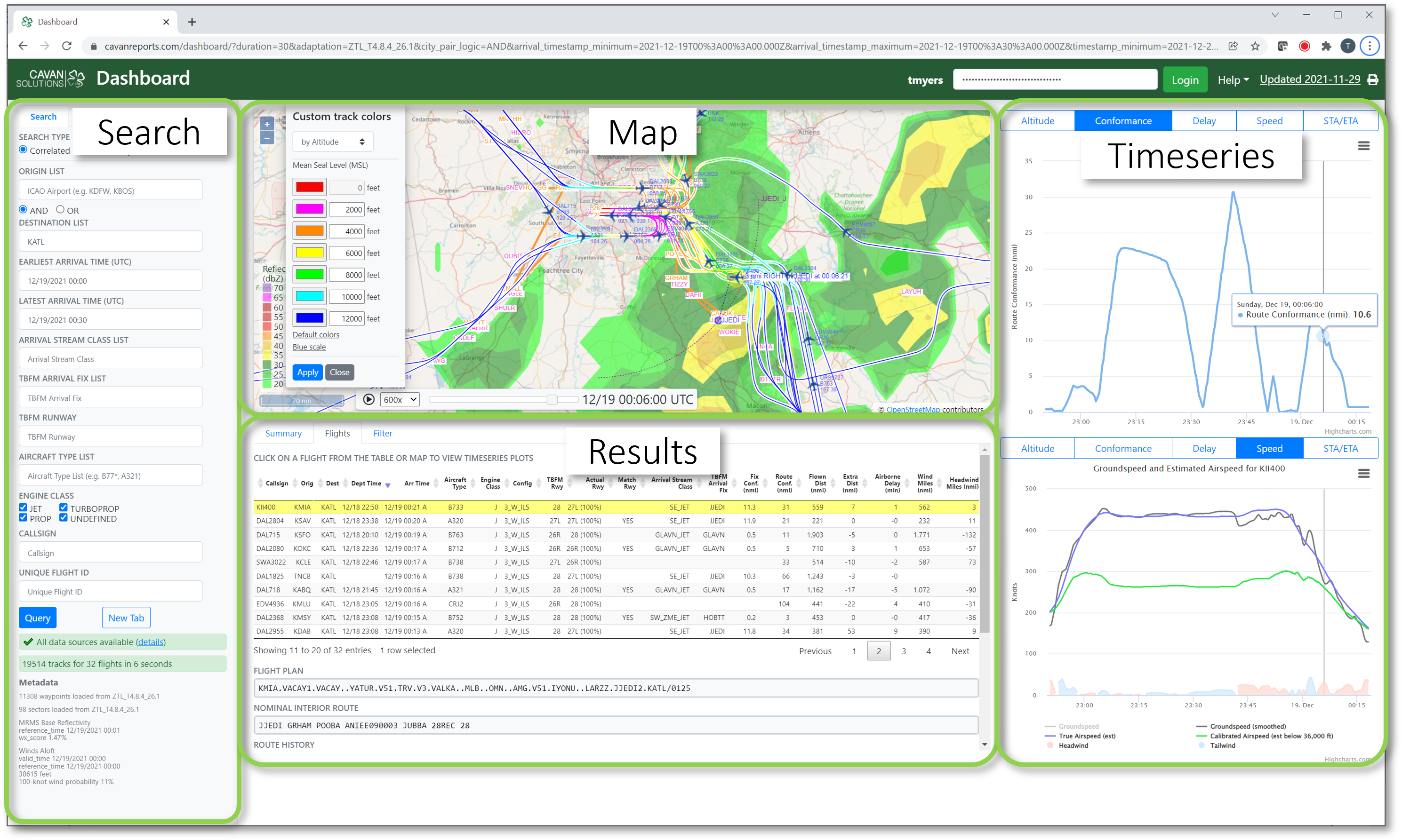 The CavanReports Dashboard provides an integrated display of TFMS, TBFM, and STARS performance metrics along with weather and adaptation data.