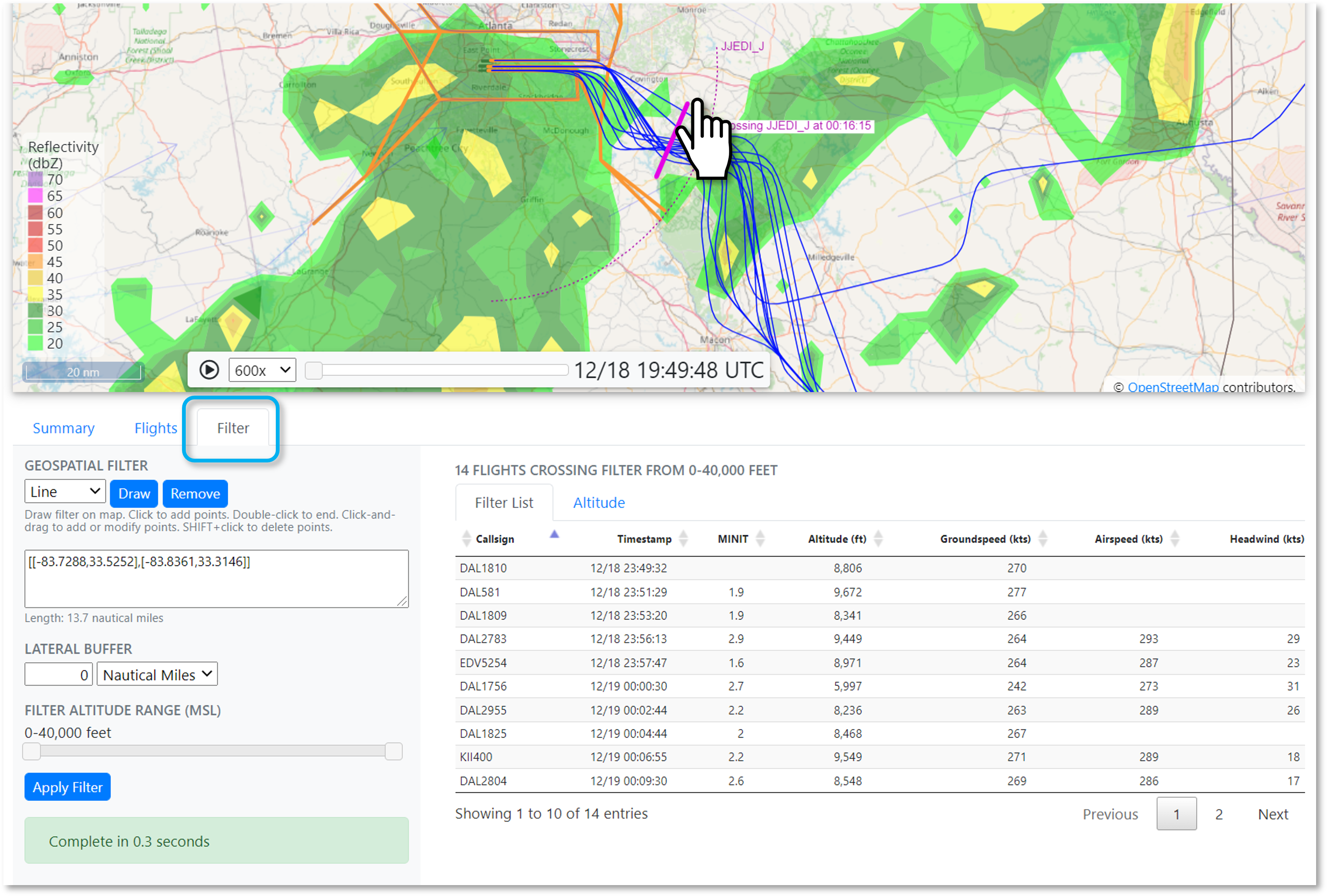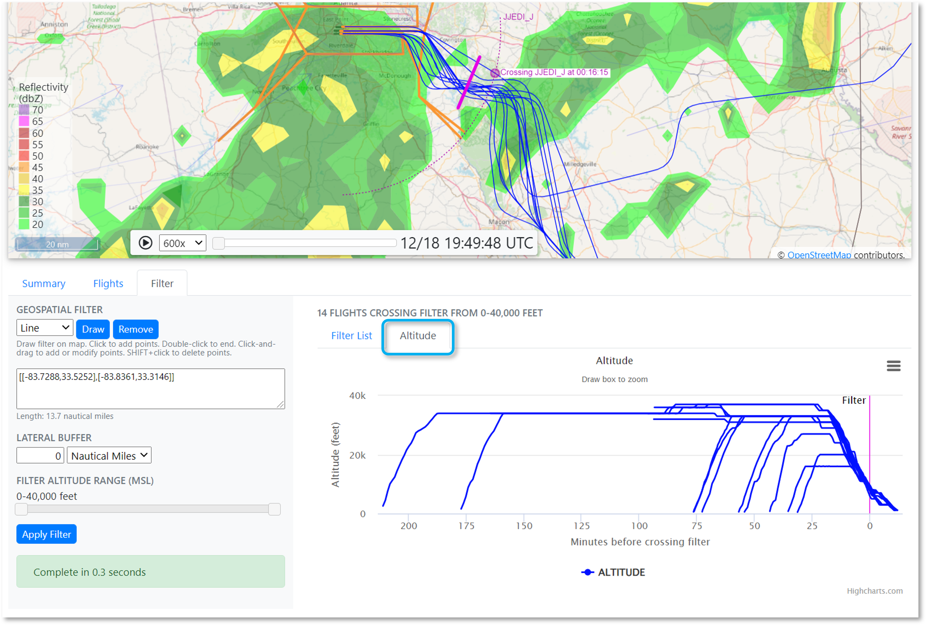 The Dashboard performs geospatial filtering using points, lines, polygons, and buffers. The filter can be hand-drawn on the map or defined by a set of coordinates. The filter can also be applied to specific altitude ranges. The list of flights meeting the filter is identified and those flights are highlighted on the map.