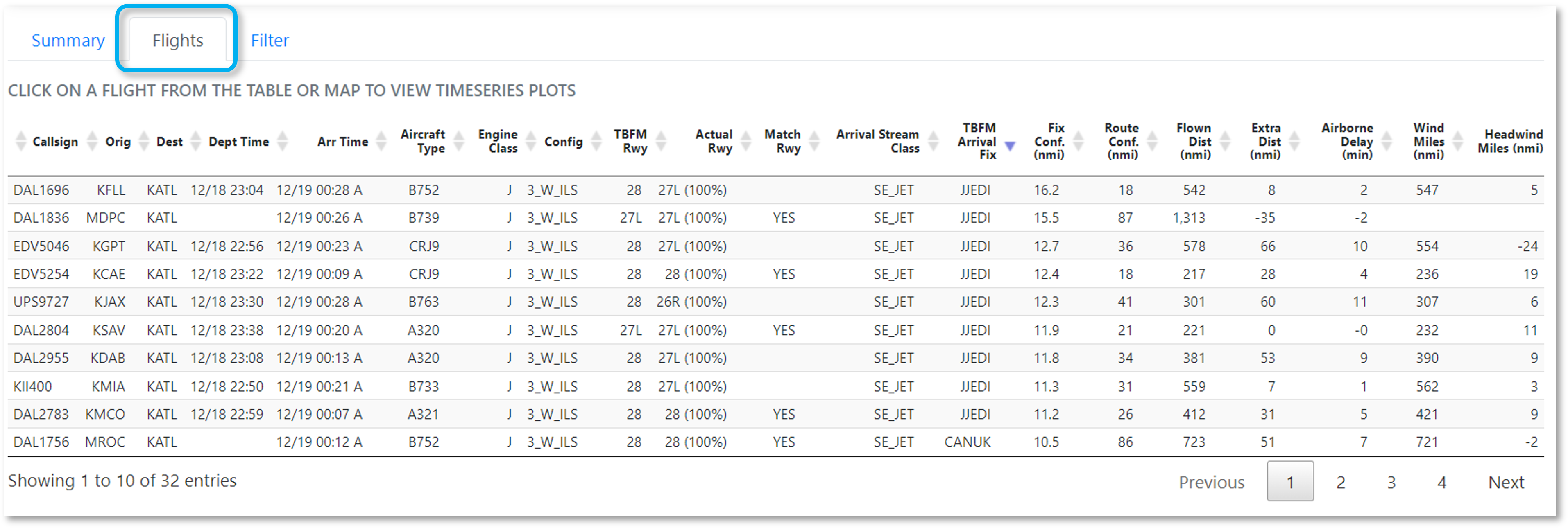 The Flights tab shows one row per flight. Each row contains flight identification information, time data, TBFM information, and several value-added metrics.