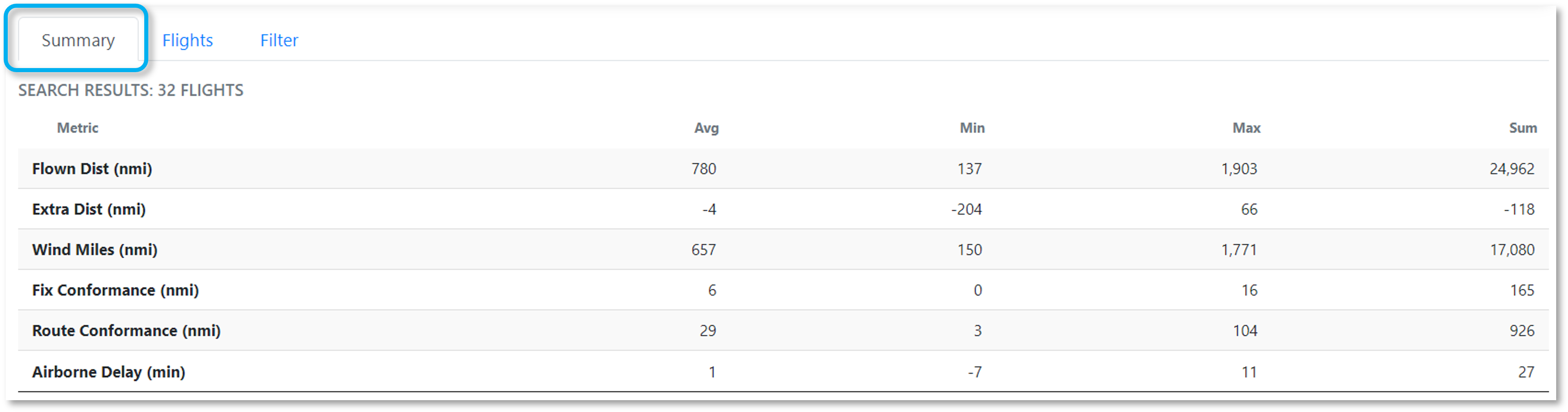 The Summary tab offers high-level metrics across all flights in the query result. For example, the average wind mileage for the 32 flights returned in the query is 657 miles.